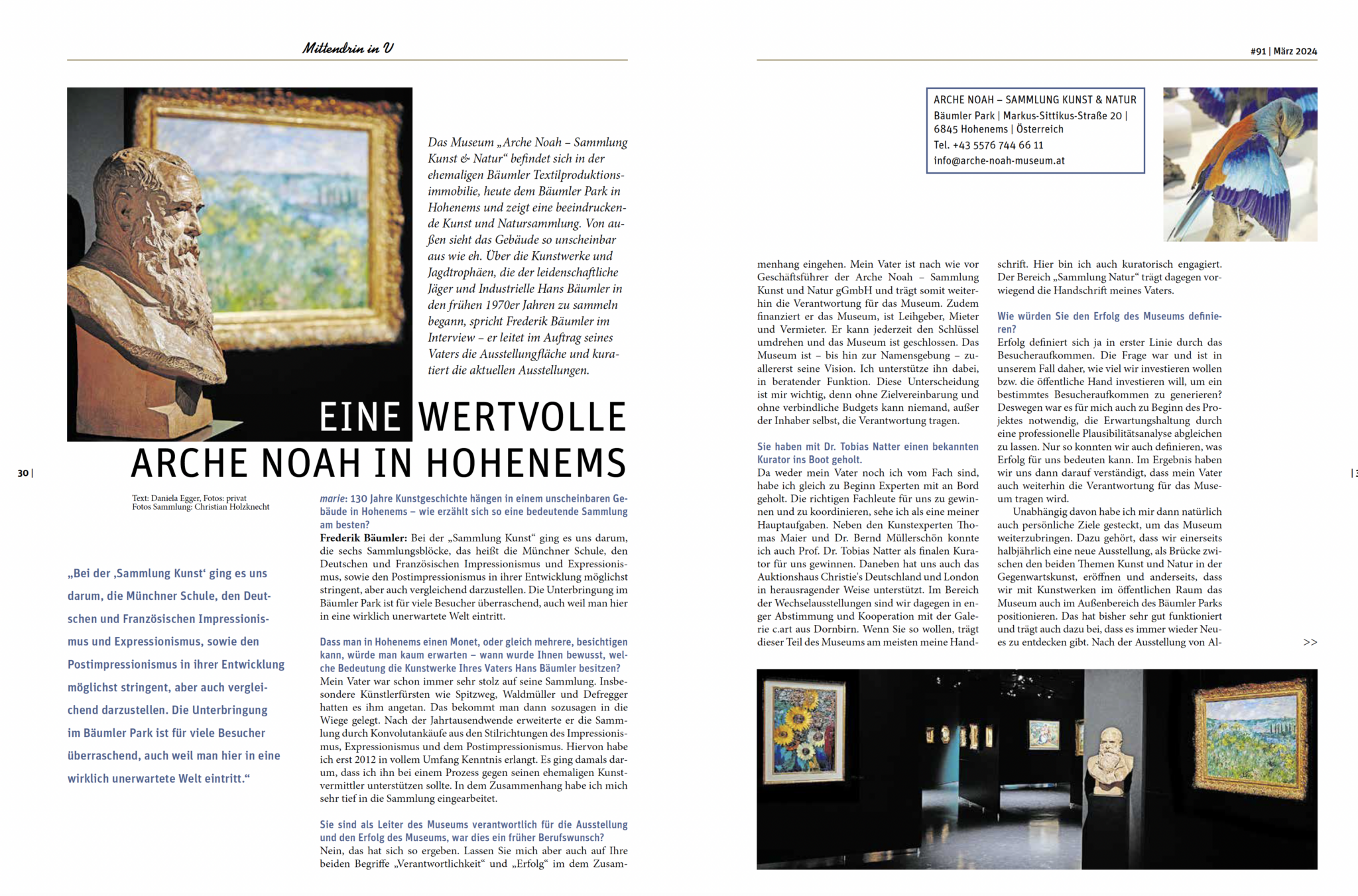 Beitrag in der „Marie“ PressestimmenBeitrag in der "Marie"Zeitschrift für Kultur&GesellschaftBeitrag in der Hohenemser WeihnachtspostBeitrag im Kontur MagazinBeitrag im DonaukurierBeitrag im DonaukurierBeitrag im Saiten MagazinEröffnungsveranstaltung Eine wertvolle Arche in Hohenems Beitrag in der„Marie“, Ausgabe April 2024