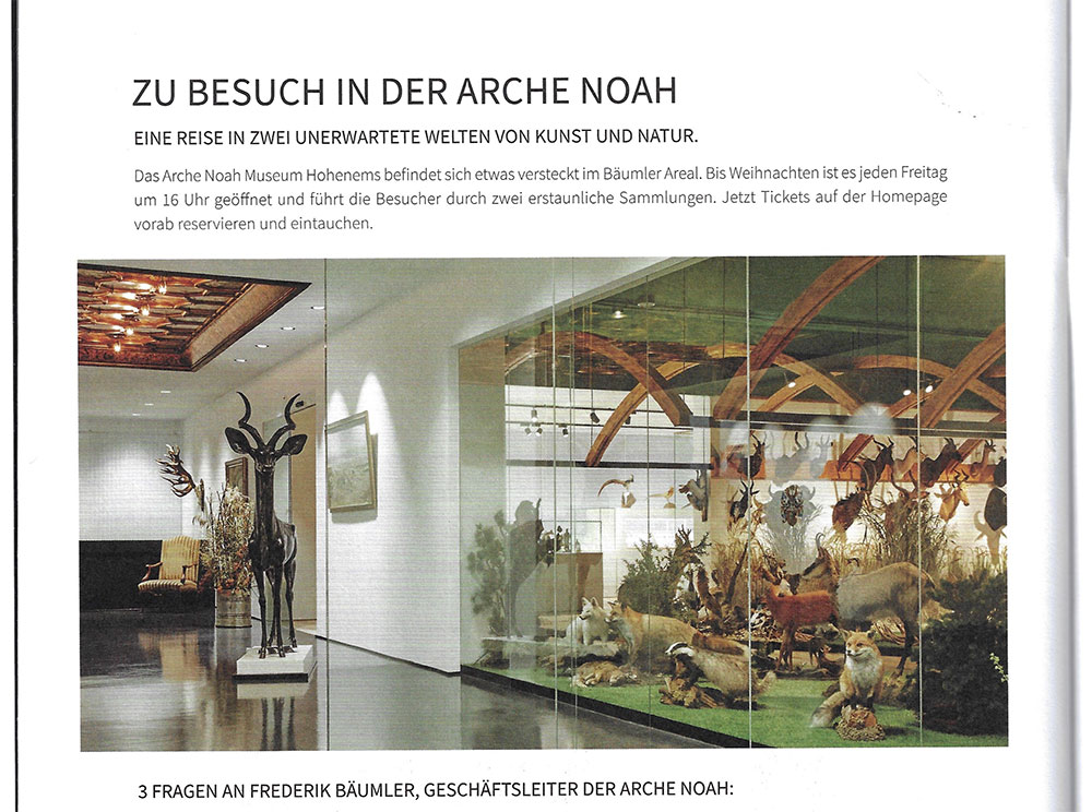 Zur Eröffnungsveranstaltung am Donnerstag, 2. Mai 2019 wurden rund 50 geladene Gäste von Presse, Politik und Kultur begrüßt. Als Festredner traten neben dem Museumsgründer und Geschäftsführer Hans Bäumler auch der Kurator für den Bereich Kunst, Prof. Dr. Tobias G. Natter, als betreuende Sachverständiger für den Bereich Natur, Mag. Joerg Gerstendörfer, sowie der Bürgermeister der StadtArray [Weiterlesen...]