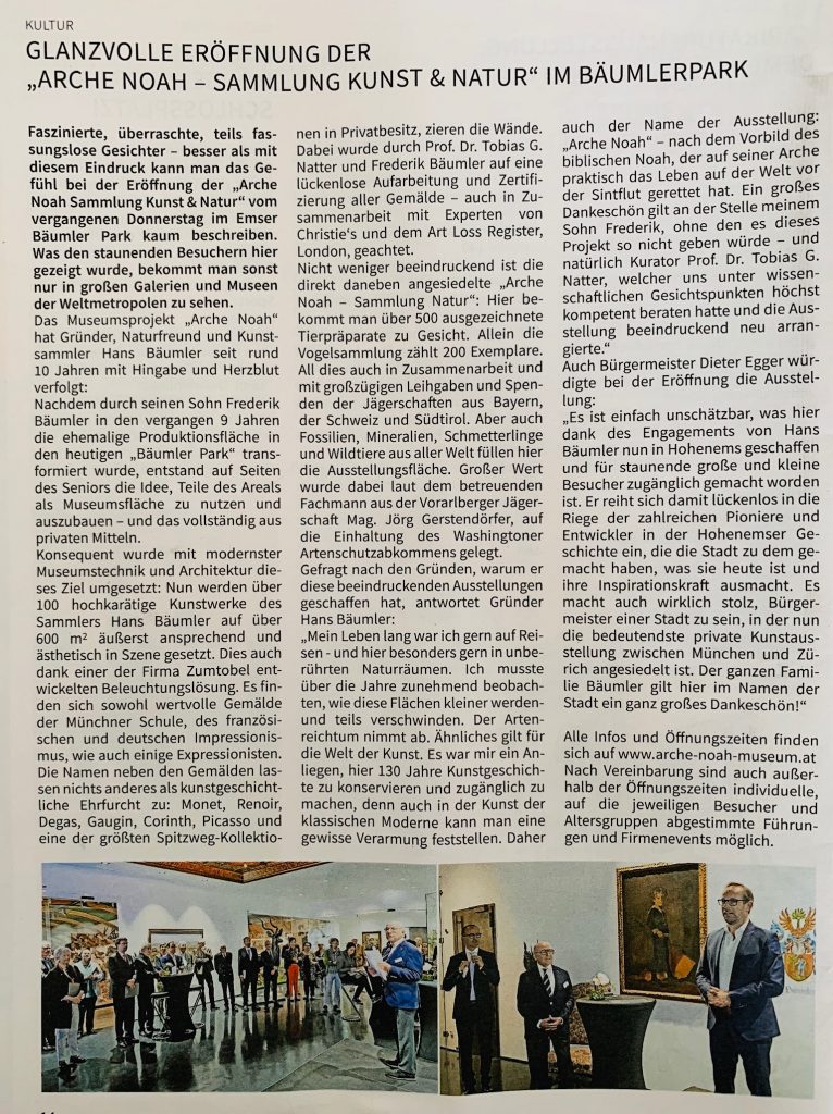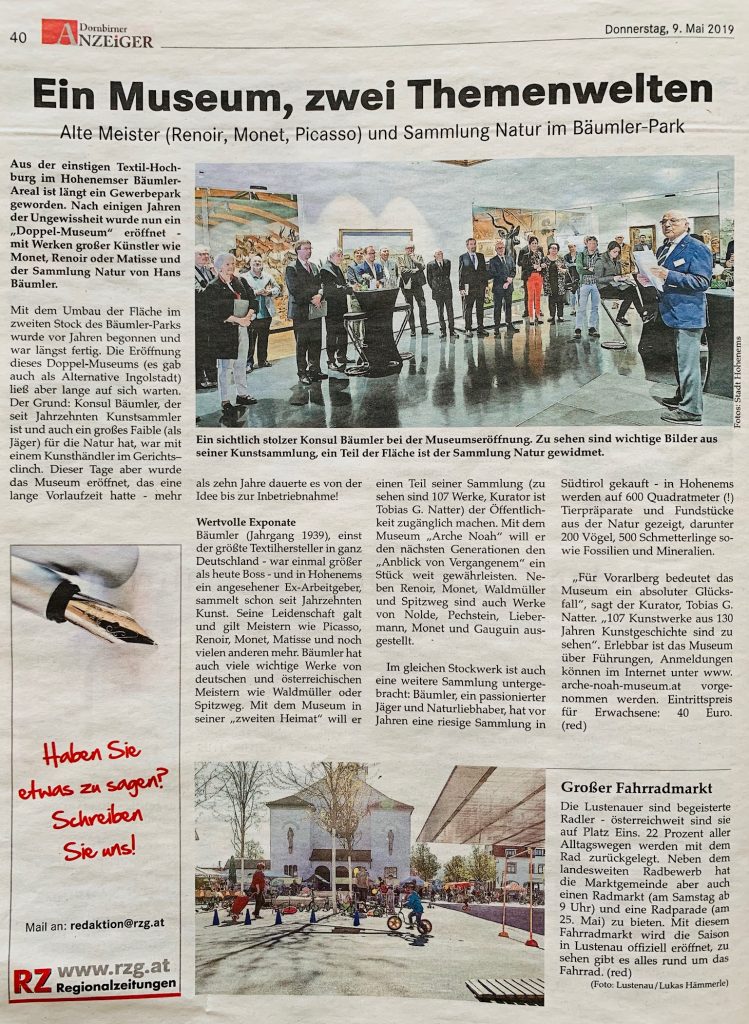 Zur Eröffnungsveranstaltung am Donnerstag, 2. Mai 2019 wurden rund 50 geladene Gäste von Presse, Politik und Kultur begrüßt. Als Festredner traten neben dem Museumsgründer und Geschäftsführer Hans Bäumler auch der Kurator für den Bereich Kunst, Prof. Dr. Tobias G. Natter, als betreuende Sachverständiger für den Bereich Natur, Mag. Joerg Gerstendörfer, sowie der Bürgermeister der Stadt Hohenems Dieter Egger, auf.
